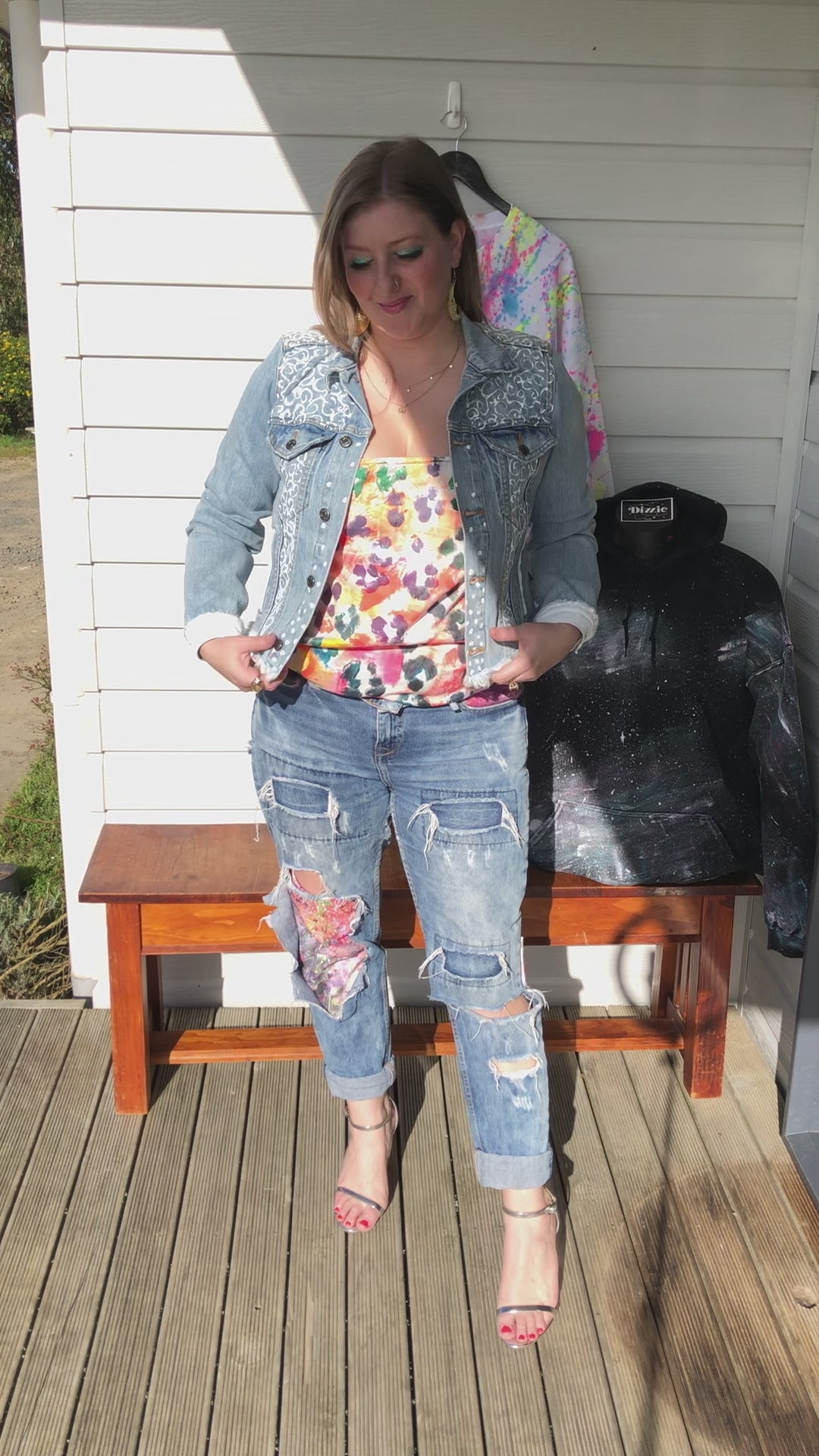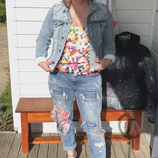 Upcycled denim, given a new lease of life with a splash of colour. This gorgeous jacket was handpainted by us, right here in Aotearoa New Zealand, using high quality fabric paints.