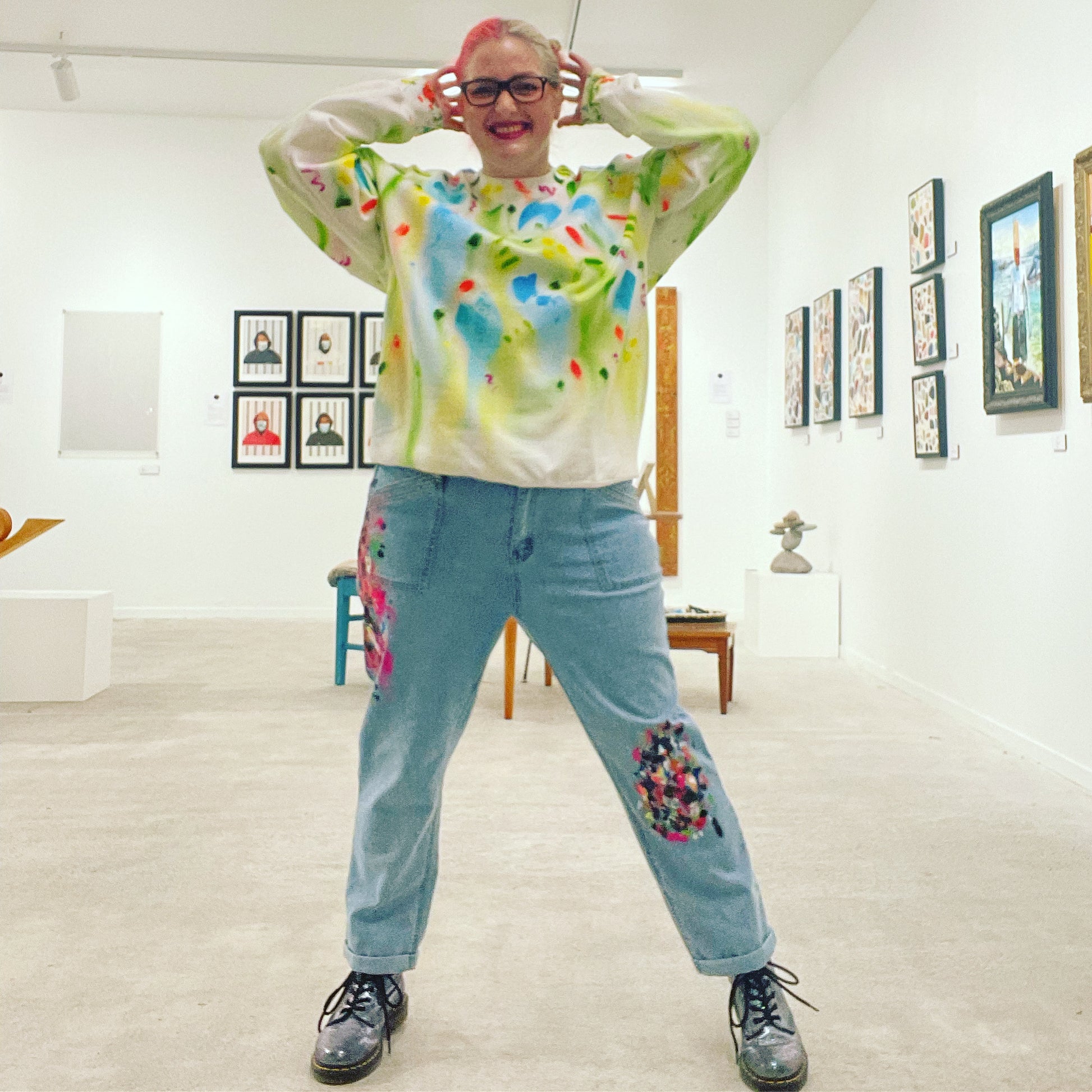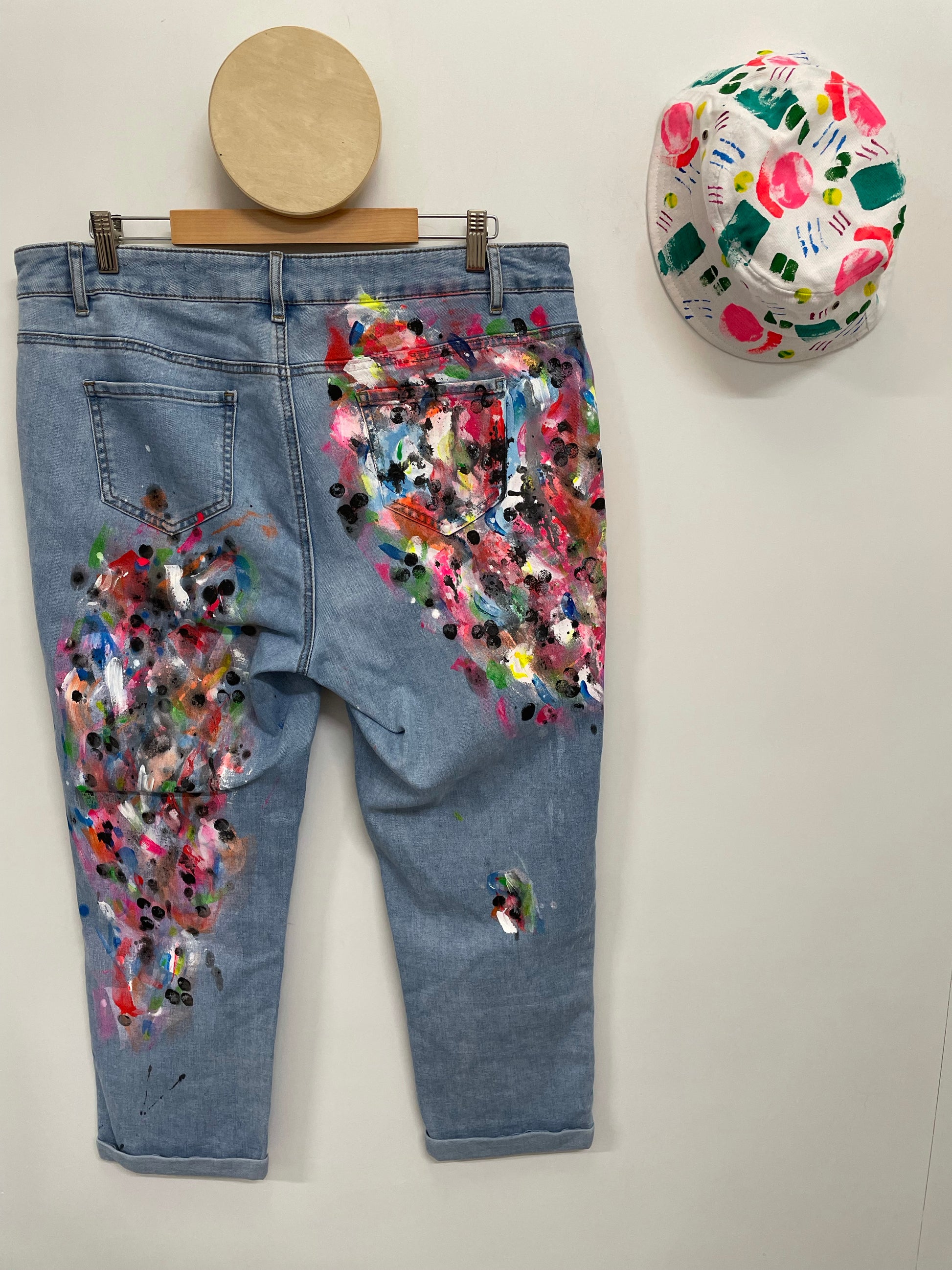 Used denim, given a new lease of life with a splash of colour. These gorgeous jeans are handpainted by us, right here in Aotearoa New Zealand, using high quality fabric paints.